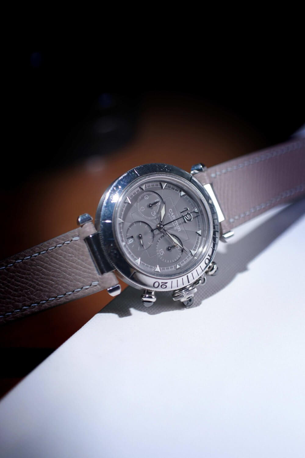 Here is a Pasha Chronograph, rendered in a big case at 38 mm (though that is considered to be small in modern days). The design cannot be mistaken, even well-spotted. The dial is quite distinctive, giving a grey hue like a pencil’s tip. Decorated with guilloché blooming from the centre, this watch visually shows something traditional watchmaking. On the case side there is what we should expect, the chained crown. For this bears a chronograph function, the crown is not alone, but with other 2 push buttons. All have synthetic black cabochon spinels which blend perfectly well with the grey dial.